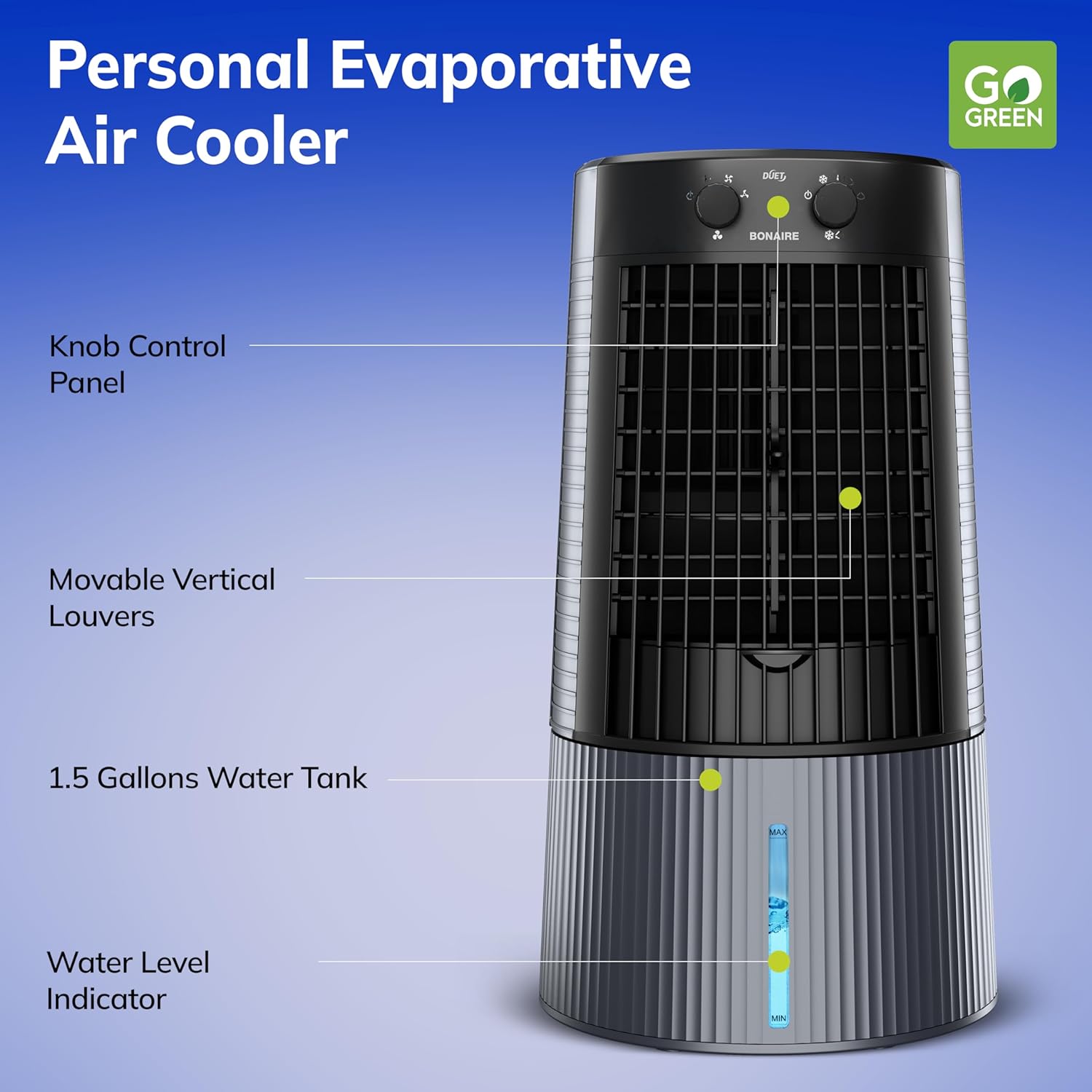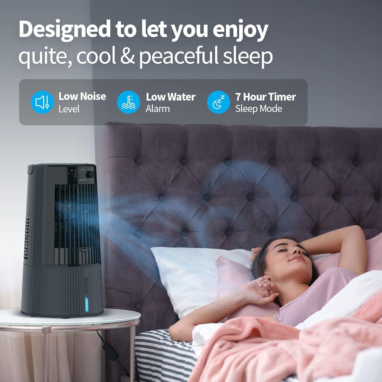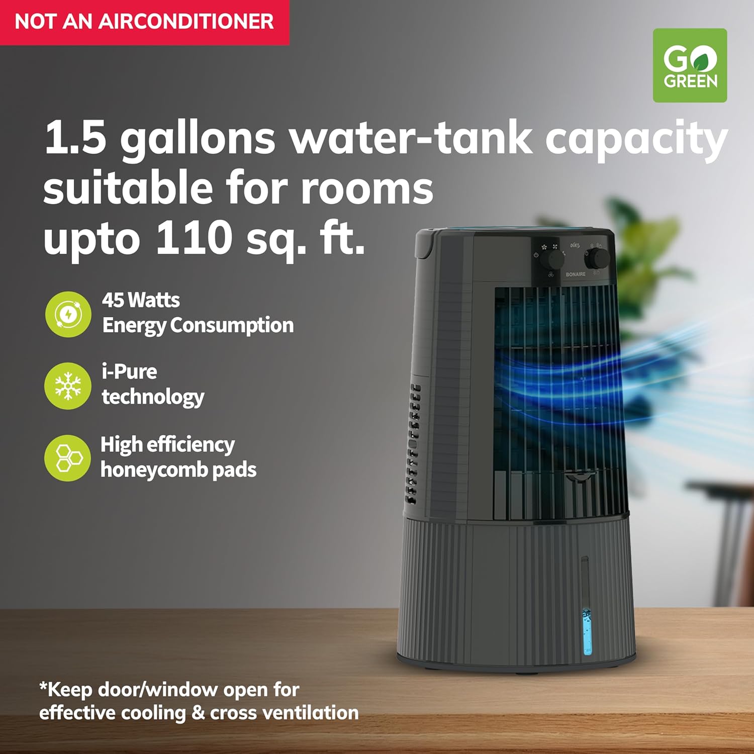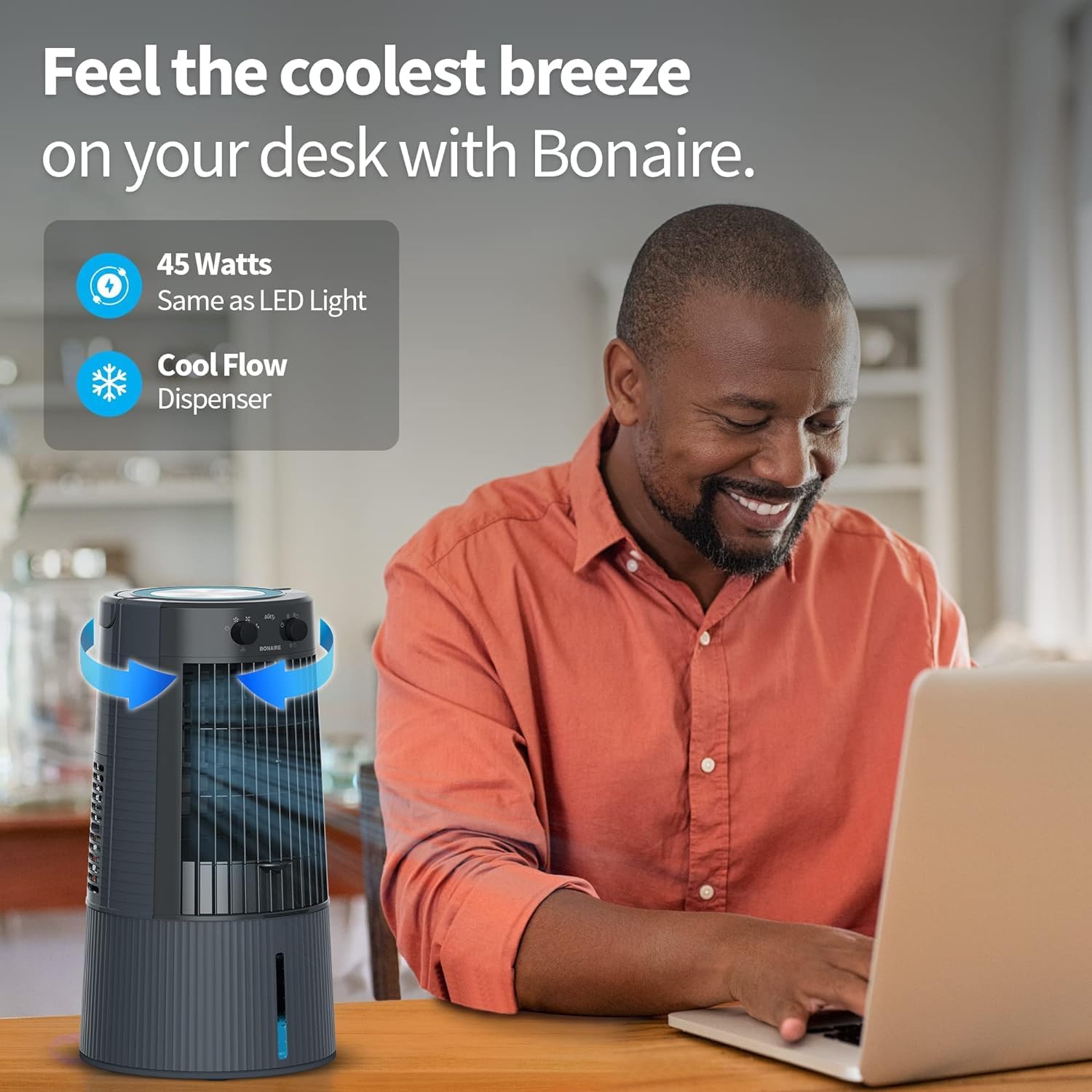Bonaire’s Evaporative Air Coolers are built with three main components. A fan, water circulating pump system, and honeycomb padding for effective cooling. This 3-speed fan absorbs warm air. Then evaporation converts the moisture into water vapor and cools it down. A more humid air then flows out from the other side.