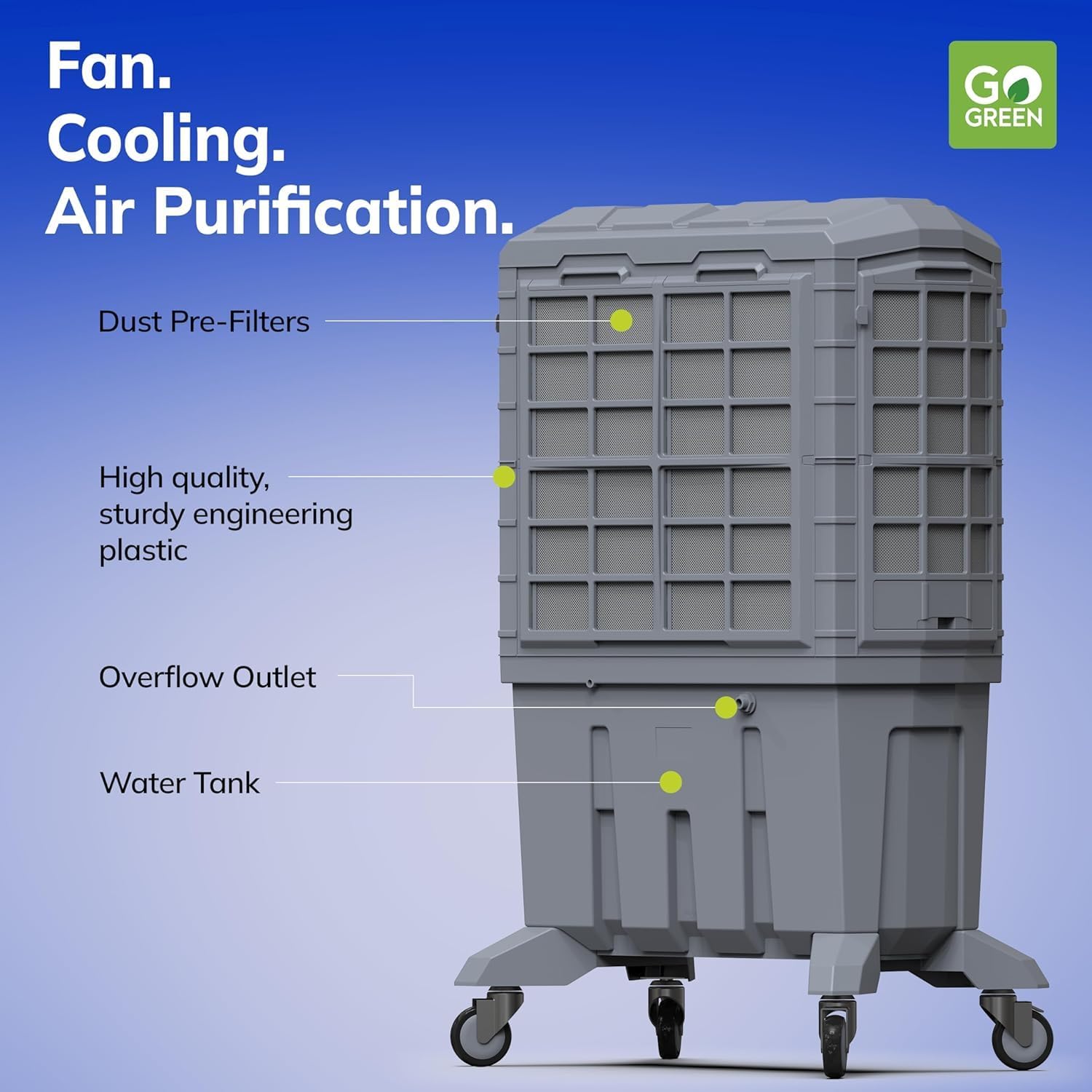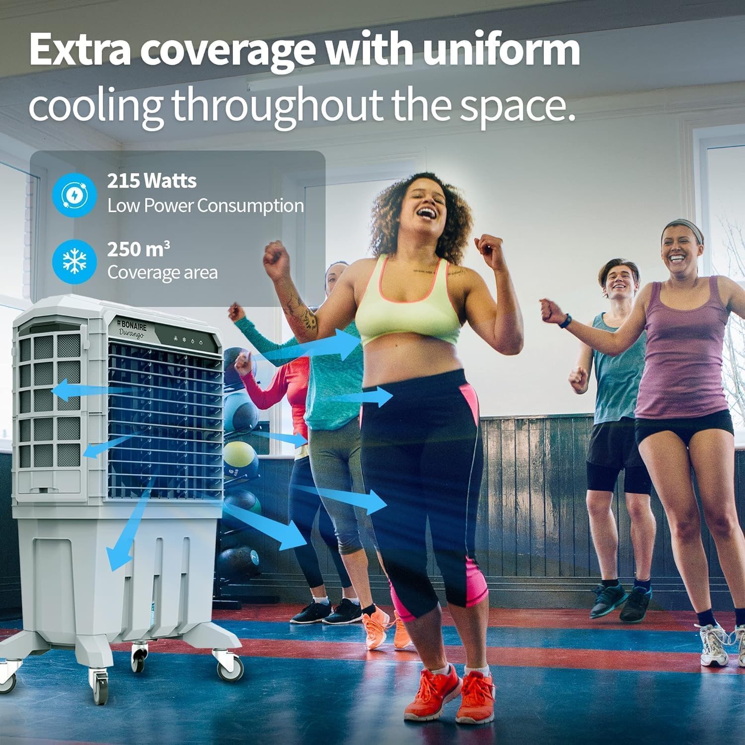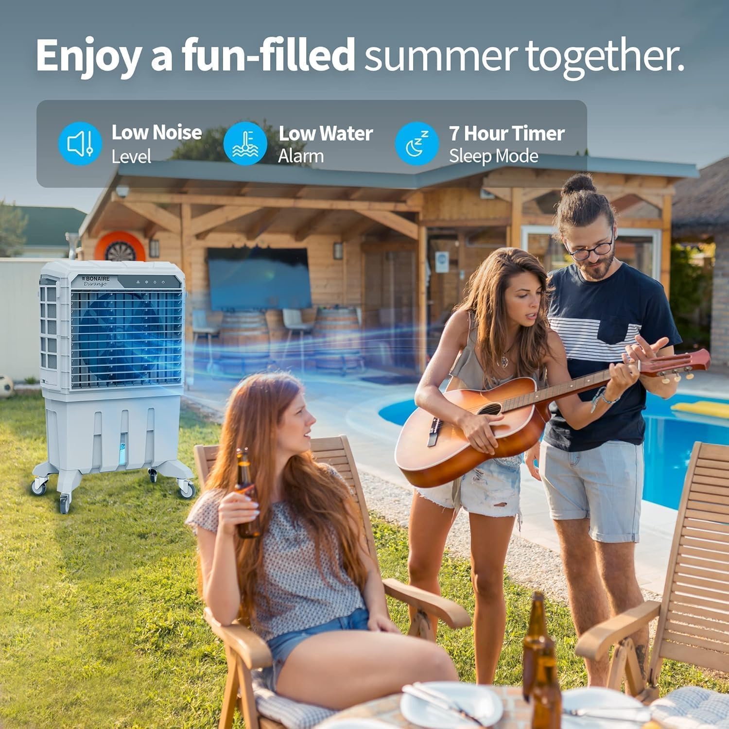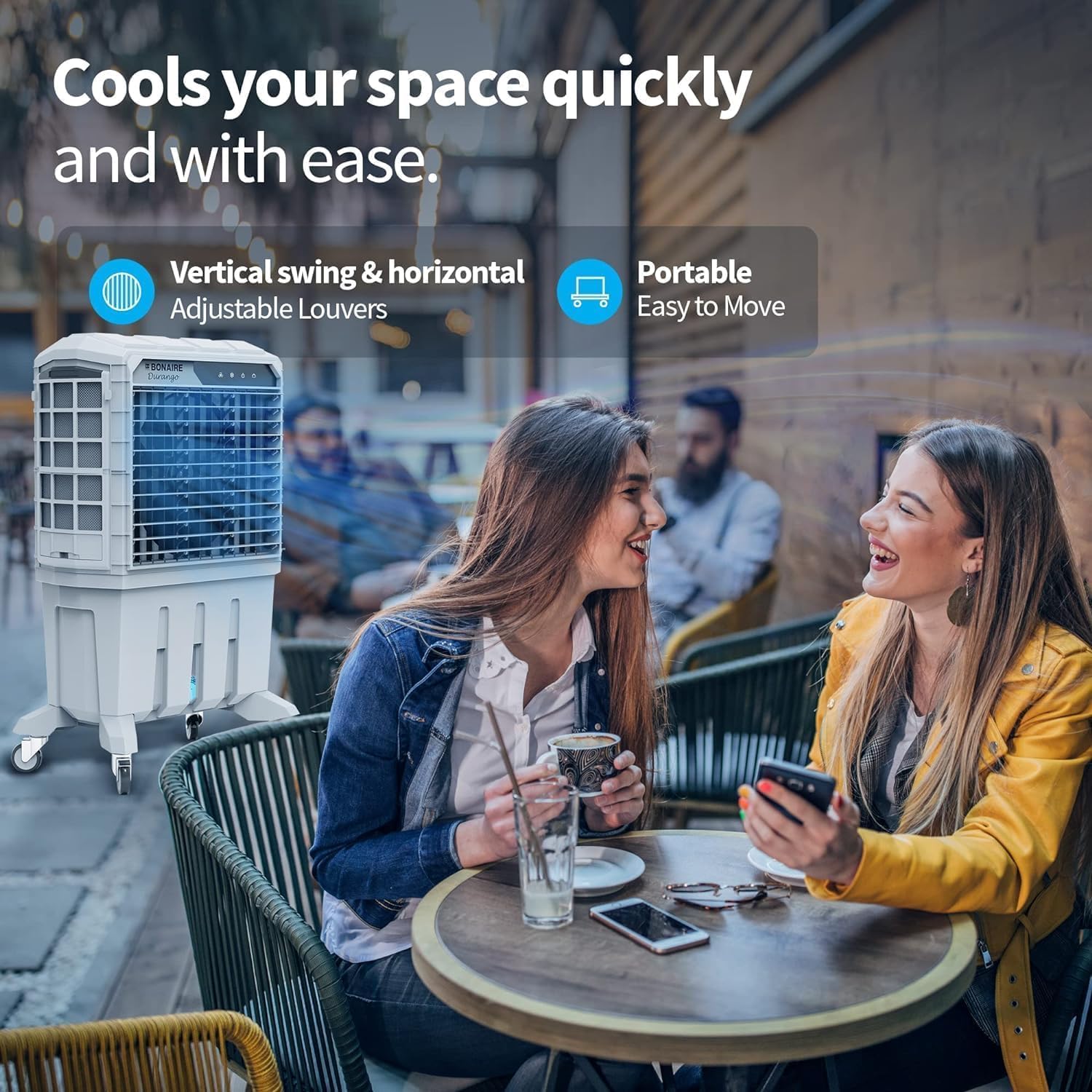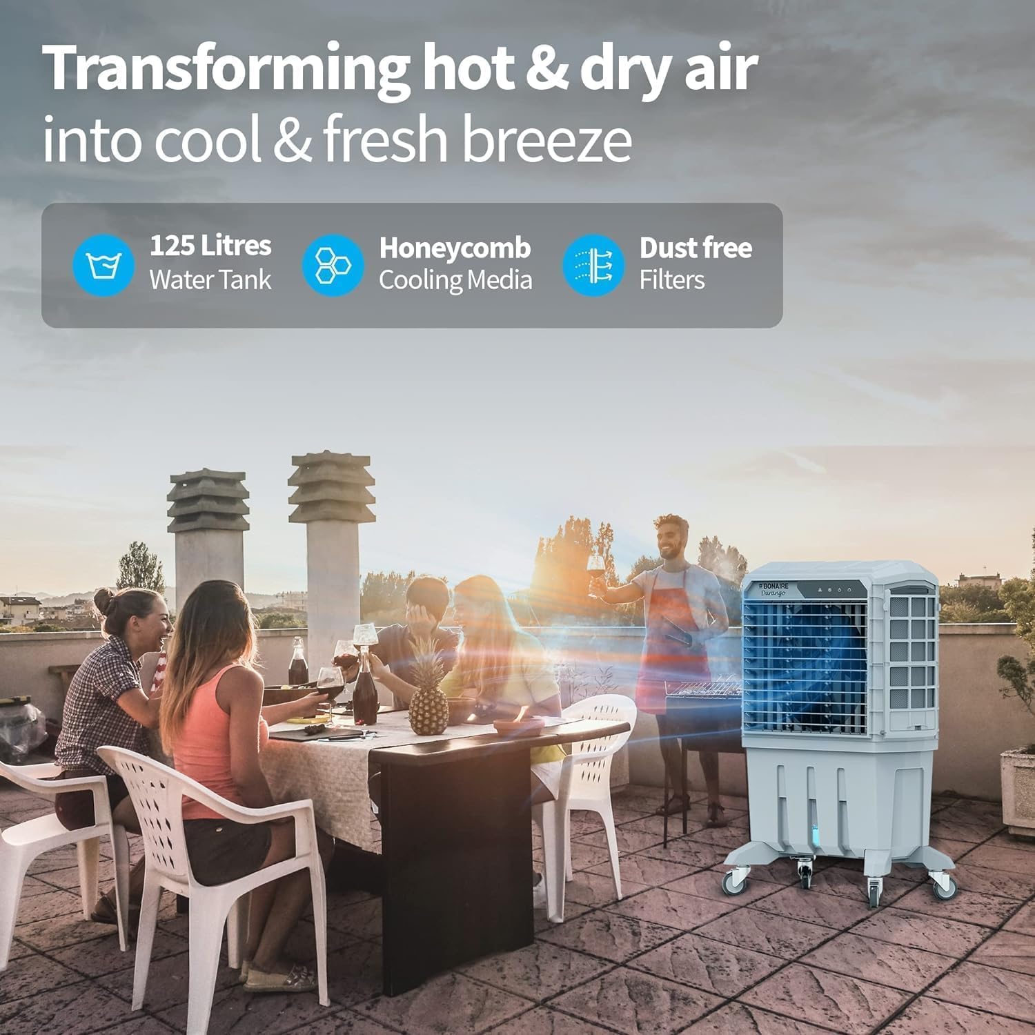 Bonaireās Evaporative Air Coolers are built with three main components. A fan, water circulating pump system, and honeycomb padding for effective cooling. This 3-speed fan absorbs warm air. Then evaporation converts the moisture into water vapor and cools it down. A more humid air then flows out from the other side.